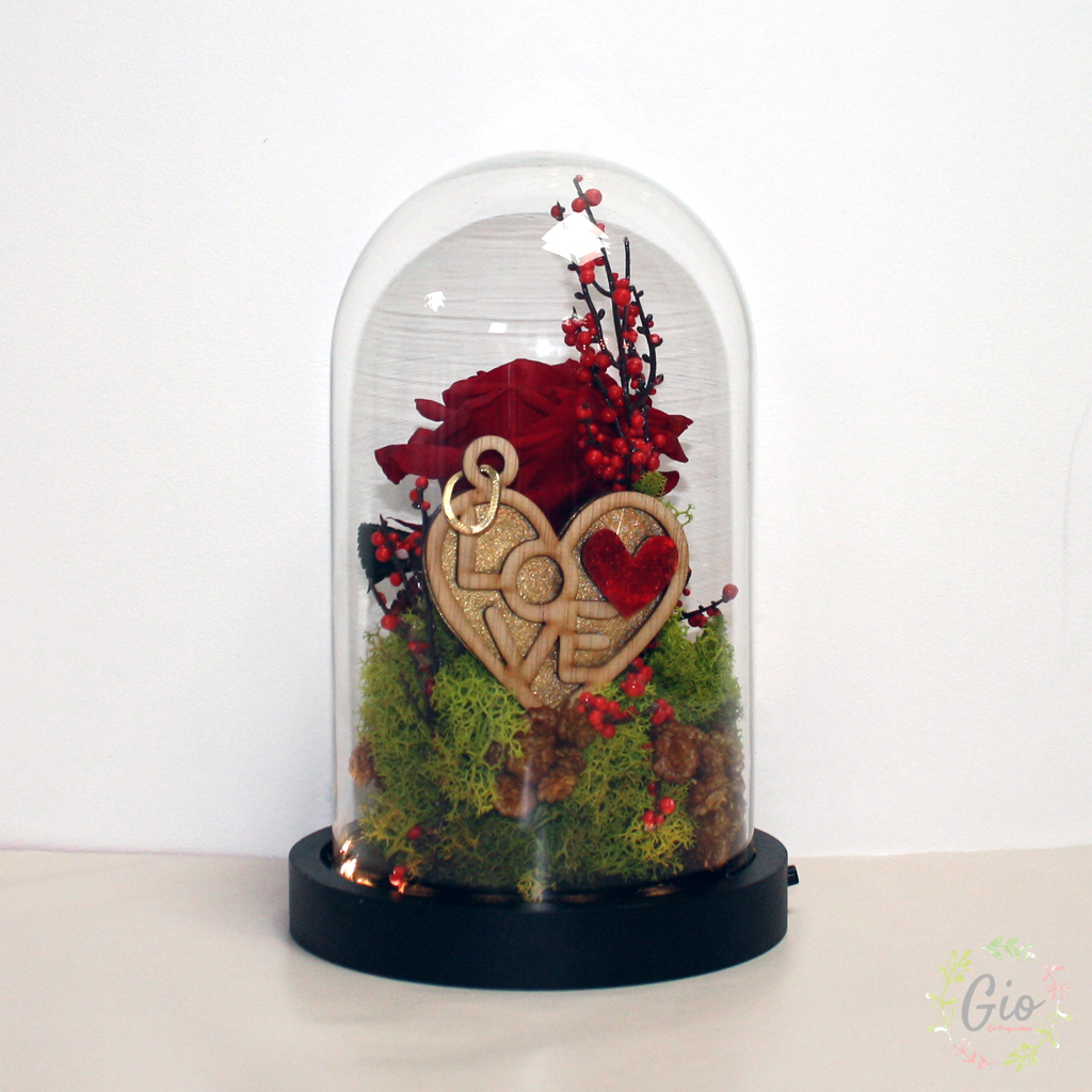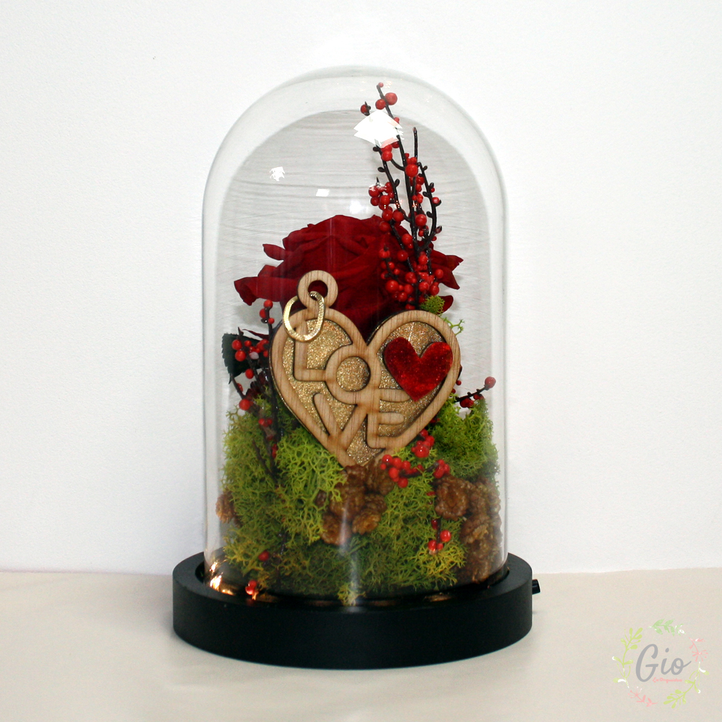 Cúpula rosa roja preservada de 20 cm altura.