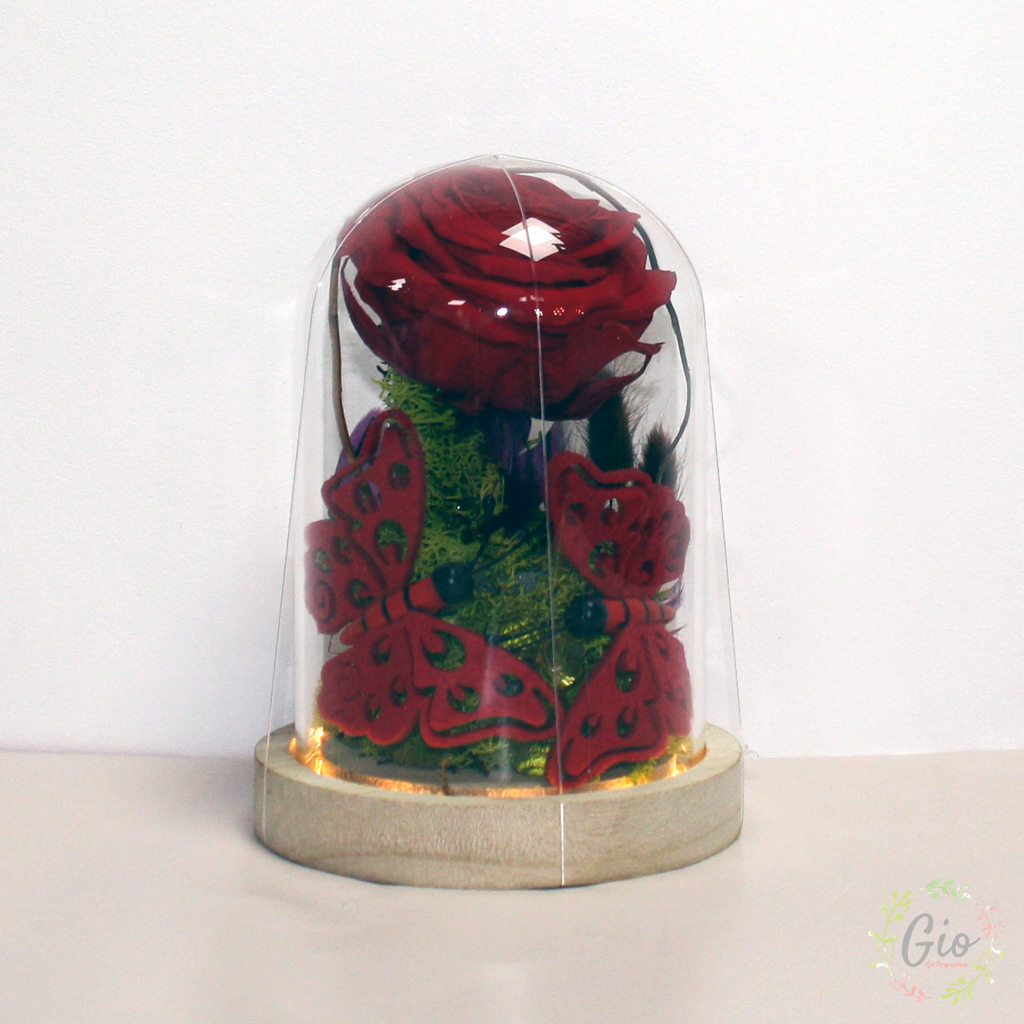 Rosa preservada en cápsula de 16 cm con Led y  maripiosas rojas.