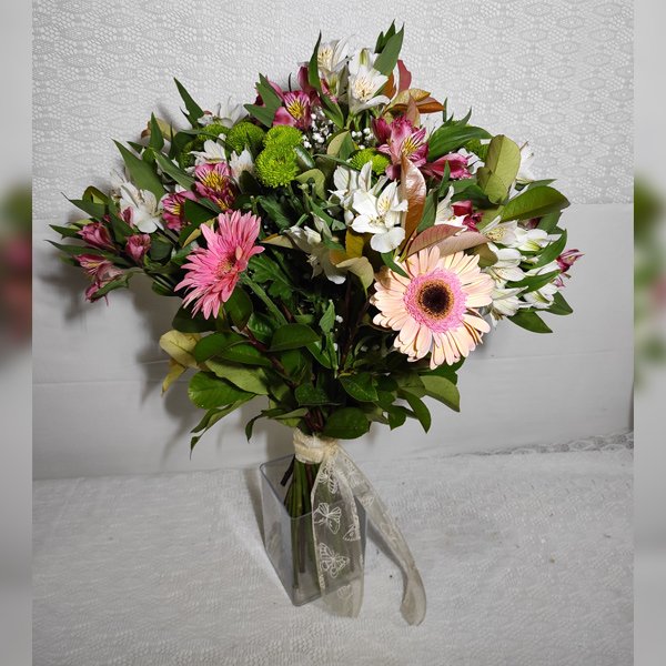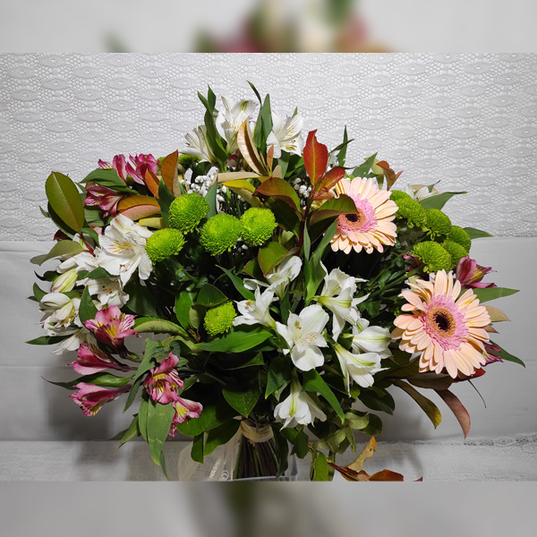 Ramo variado con Alstroemerias blancas y rosas, Gerberas rosas, crisantemo verde y verdes variados.