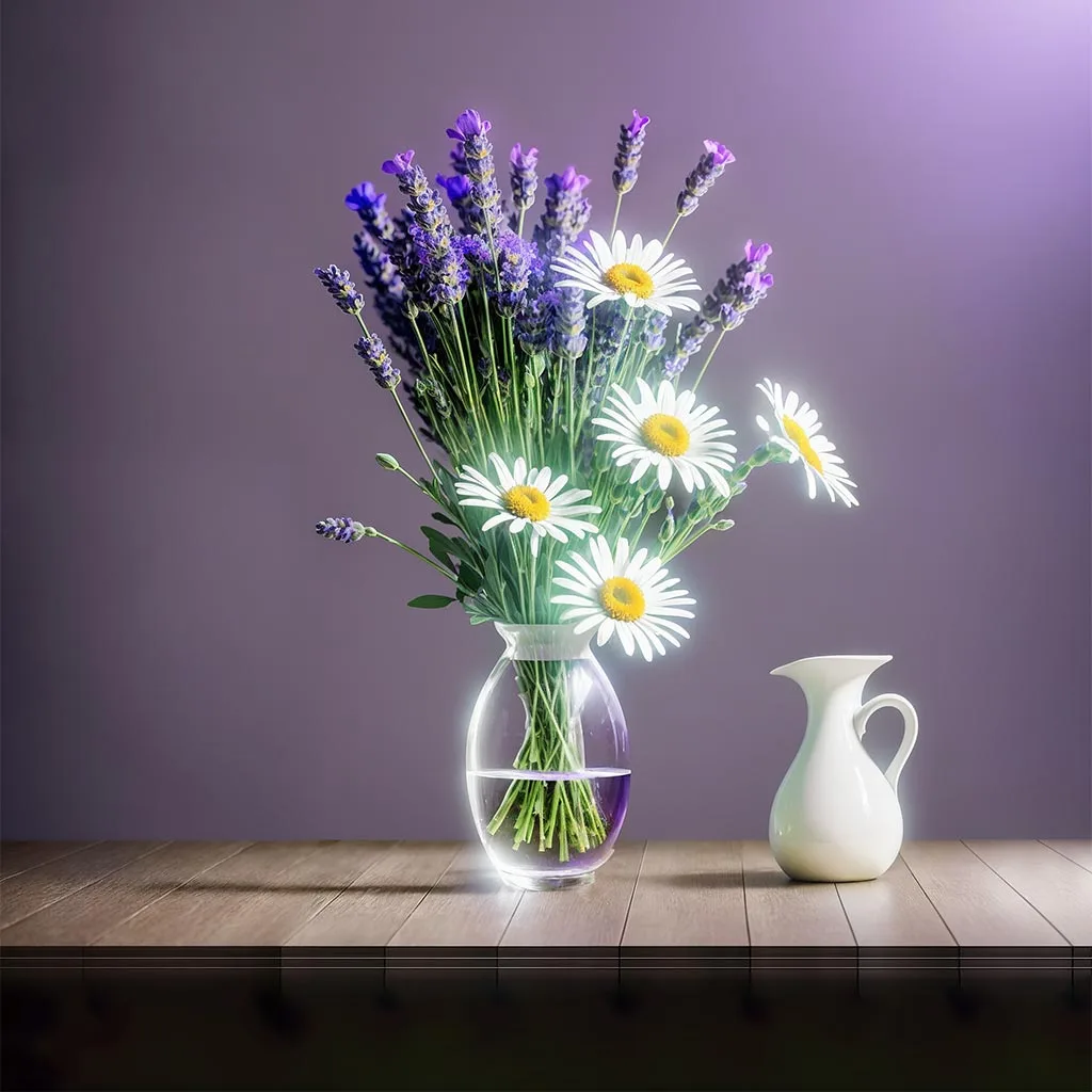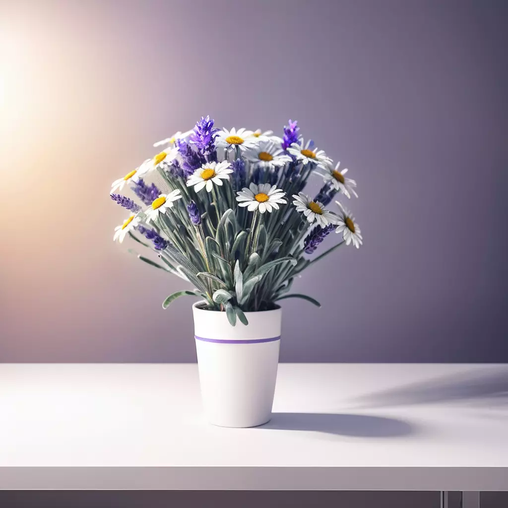 Nuestro Ramo de flores no solo es hermoso, sino que también es perfecto para decorar cualquier espacio. Las margaritas son flores duraderas que pueden durar hasta dos semanas, mientras que la lavanda es conocida por su fragancia relajante que perfumará cualquier habitación.